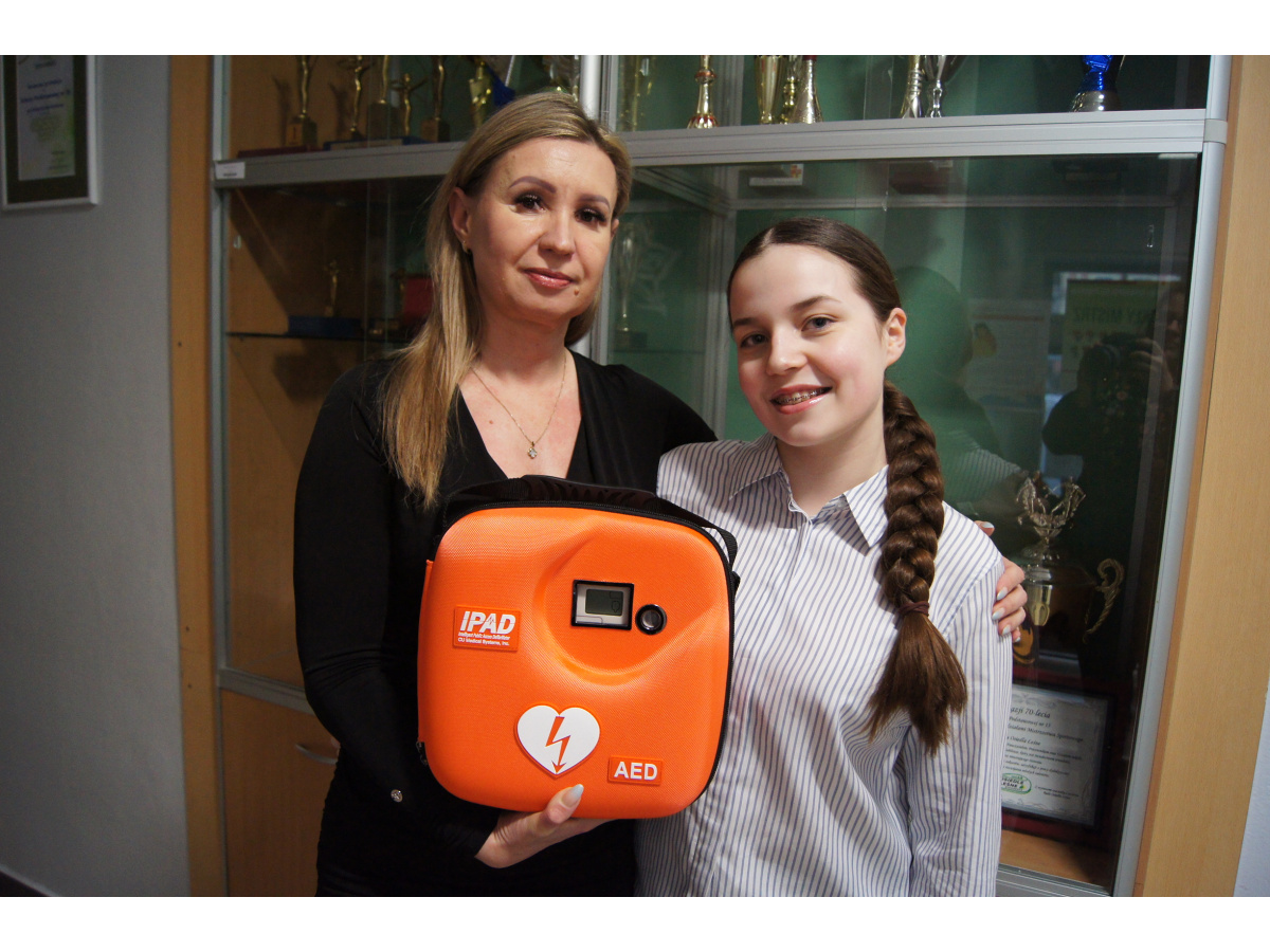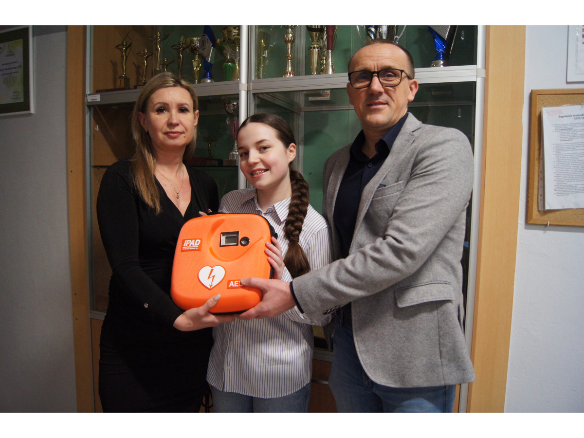 Uroczyste przekazanie defibrylatora AED, zakupionego z inicjatywy Rady Rodziców odbyło się 19 lutego w obecności dyrektora Tomasza Gadzińskiego. Urządzenie na ręce przewodniczącej Samorządu Uczniowskiego, Zuzanny Majewskiej, przekazała zastępczyni przewodniczącej Rady Rodziców, Magdalena Bilska. Na tę wyjątkową okazję pani Magdalena Bilska przygotowała również okolicznościowy tort, który był miłym akcentem podkreślającym rangę wydarzenia.