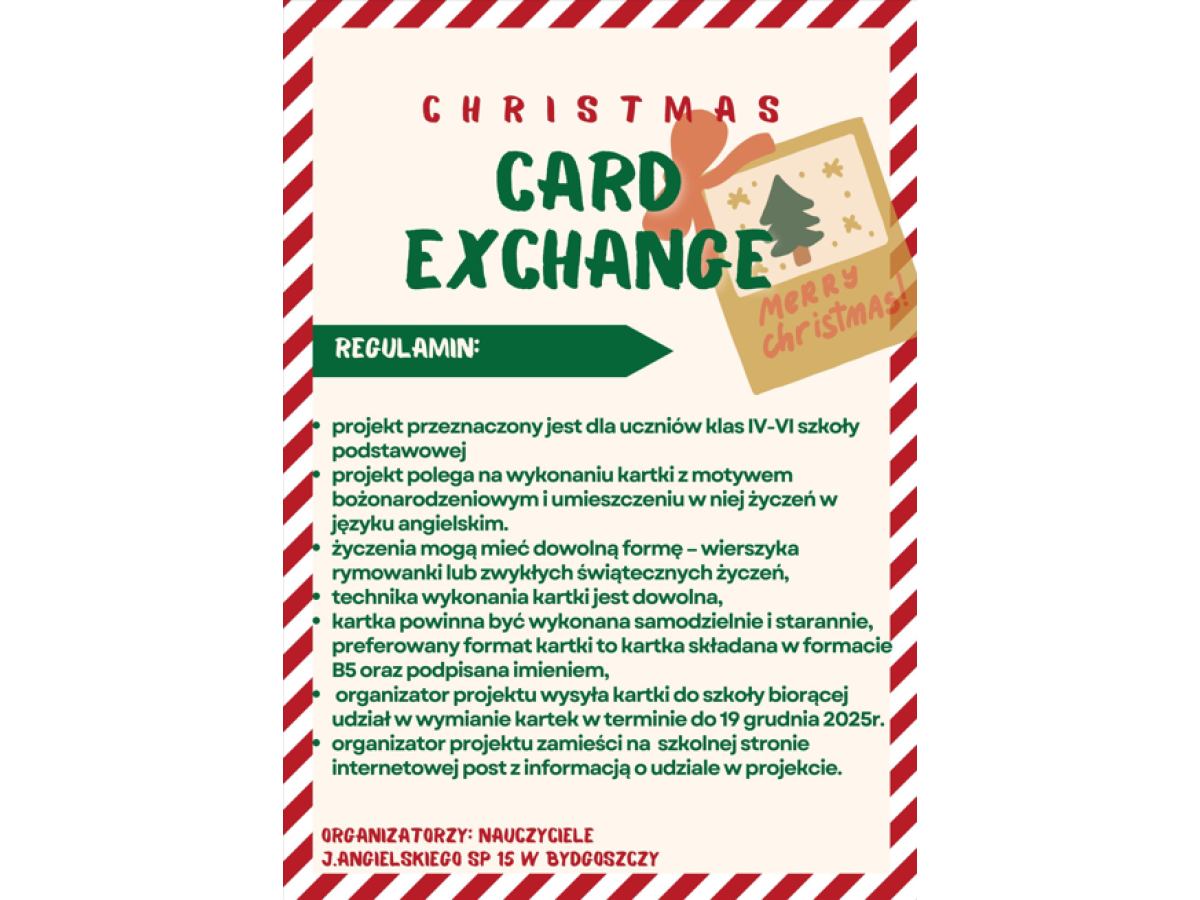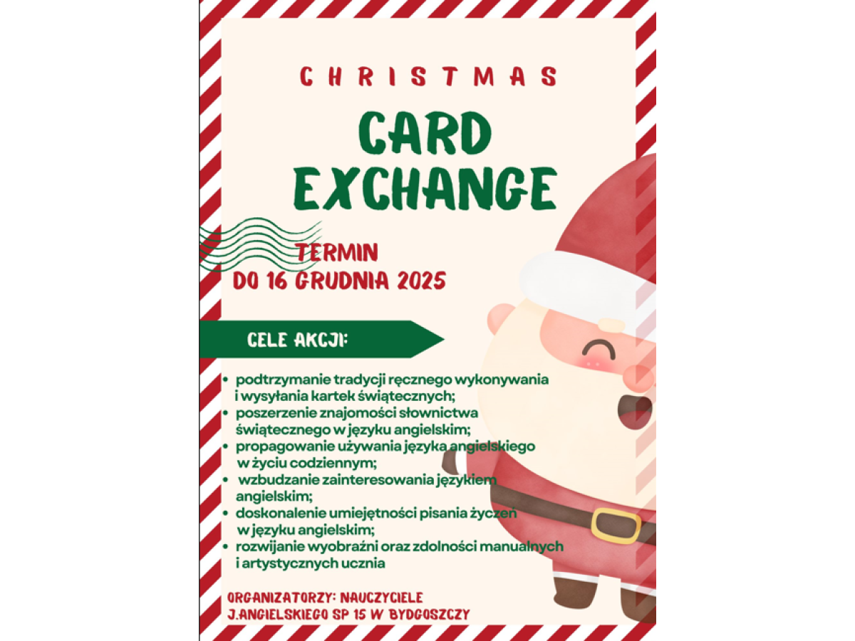 Uwaga, Uczniowie klas IV-VI! Zachęcamy do wzięcia udziału w tegorocznej edycji akcji Christmas Card Exchange. Aby wziąć udział, zgłoście się do Waszych nauczycielek języka angielskiego. Termin oddania podpisanych kartek to 16.12.2025 r.