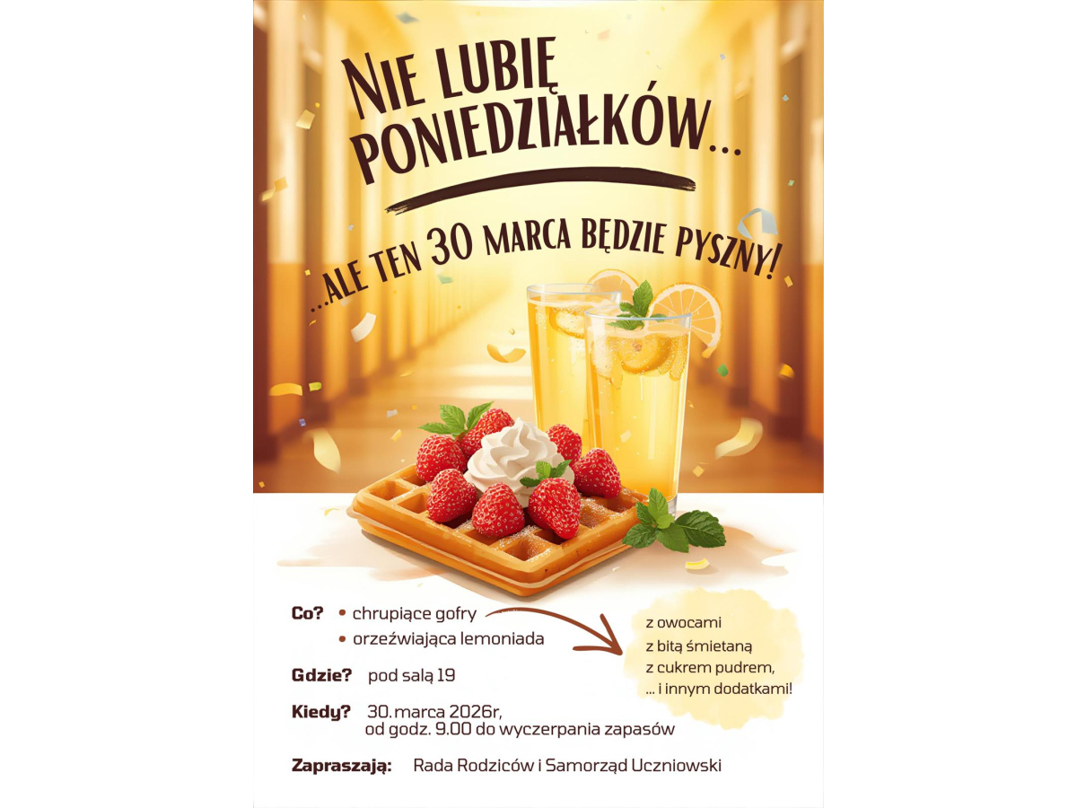 30 marca w naszej szkole czeka na Was wyjątkowa akcja przygotowana przez Radę Rodziców i Samorząd Uczniowski. Tego dnia szkolny korytarz wypełni się zapachem świeżych, chrupiących gofrów!