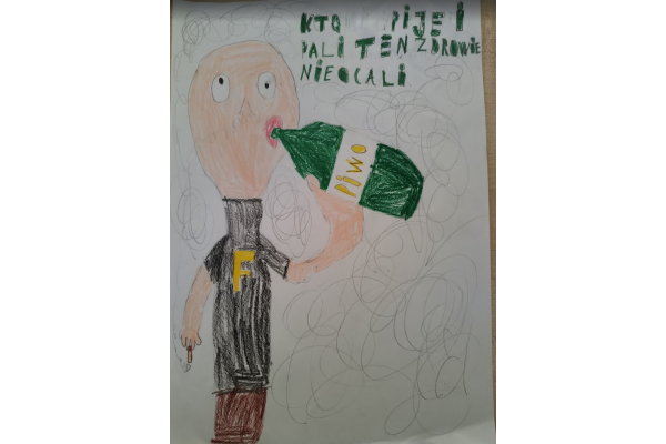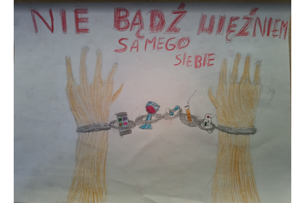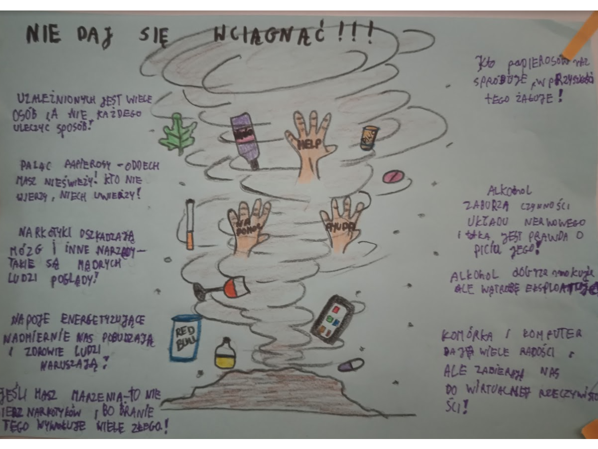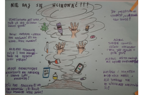 W ramach konkursu uczniowie przygotowali prace, w których ostrzegali swoich rówieśników przed uzależnieniami od różnych używek, takich jak papierosy, alkohol czy inne szkodliwe substancje.