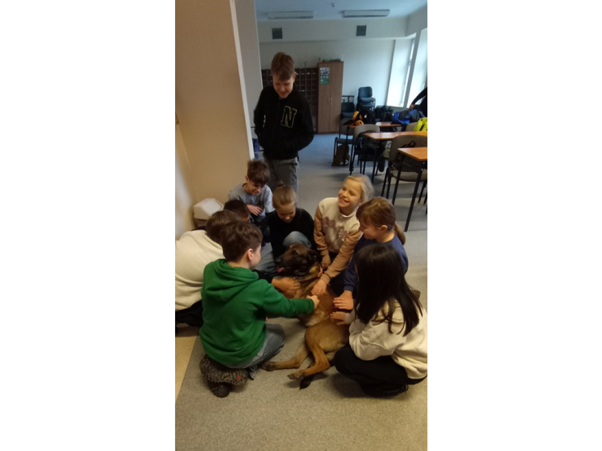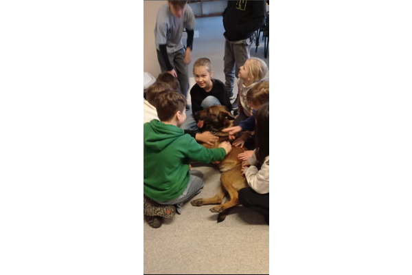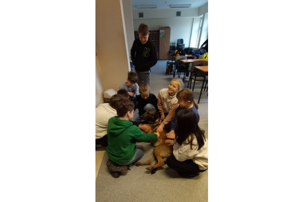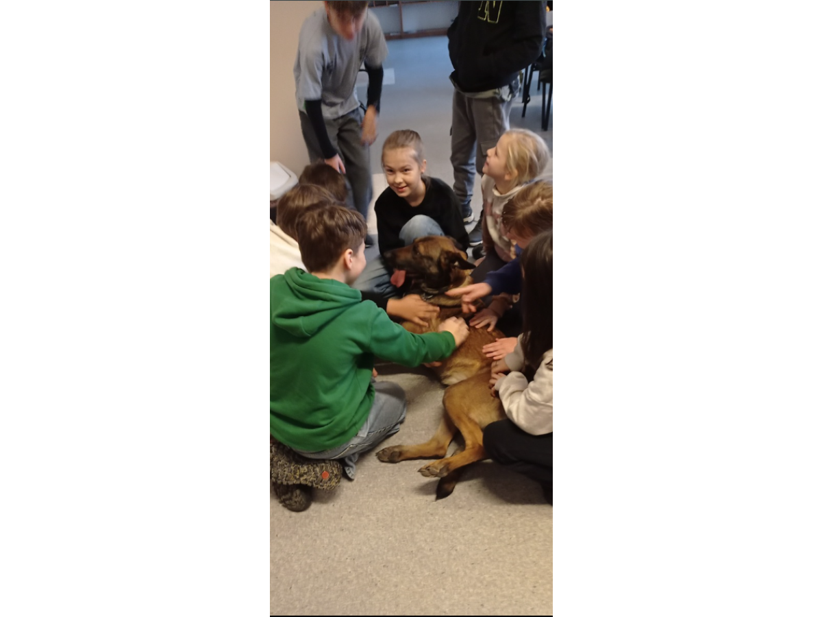 Dużą atrakcją było spotkanie z psem policyjnym, który okazał się nie tylko profesjonalnym funkcjonariuszem ale też wielkim pieszczochem i wzbudził ogromne zainteresowanie wśród uczniów. Dzieci poznały również maskotkę bydgoskiej policji - Polfinka, sympatycznego delfina w mundurze policyjnym.